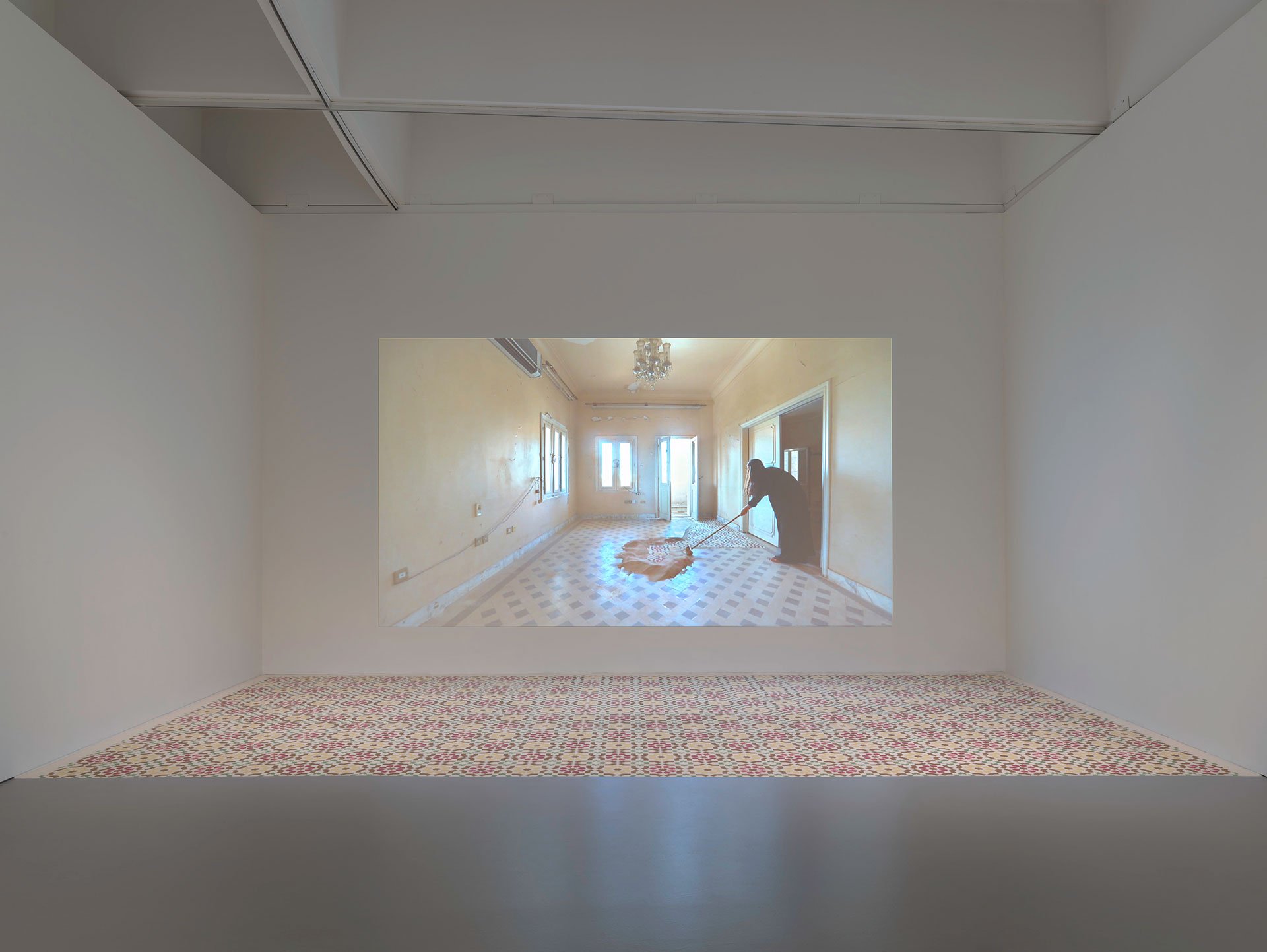 Presented in the Pigott Gallery, a geometric floor composition meticulously constructed in coloured sand is paired with a single-channel film which shows the artist sweeping away the work’s recreation inside an abandoned Jeddah house, built in the European architectural style. This work celebrates traditional Islamic design and sacred geometry while exploring the cycle of creation and destruction.